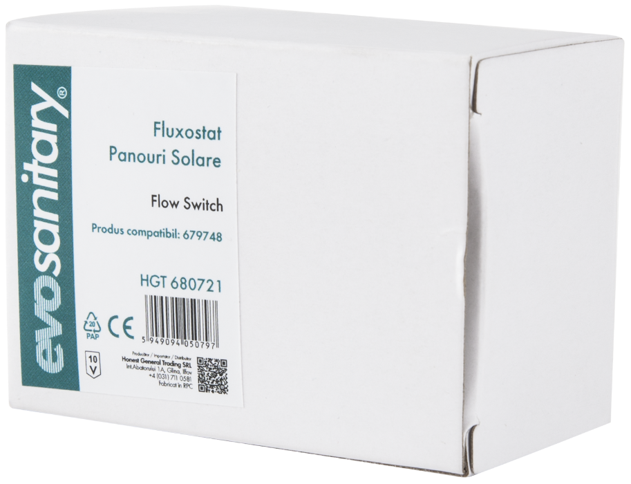 The flow switch for solar panels is a device used in solar thermal systems to control and monitor circulation of the hot fluid (typically water or an antifreeze solution) in the panels and throughout the system. Its role is to regulate and maintain the flow at the optimal level to ensure efficient collection of solar energy and its transfer to the heating system or the domestic hot water storage tank. The flow switch can be easily installed in the solar panel system, typically featuring standard connections for supply and return pipes. Compatible with: 679748.